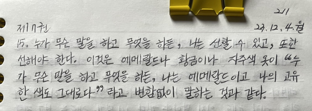 어제는 ‘누가 무슨 말을 하고 무엇을 하든, 나는 선할 수 있고, 또한 선해야 한다.’라는 말이 그 어느 때보다 절실했던 날이었다.