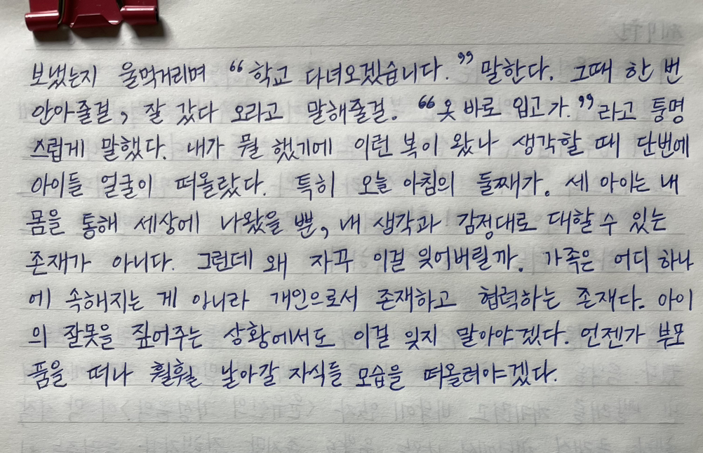 부엌에서 설거지를 하고 있는데 남편이 보냈는지 울먹거리며 “학교 다녀오겠습니다.” 말한다.
