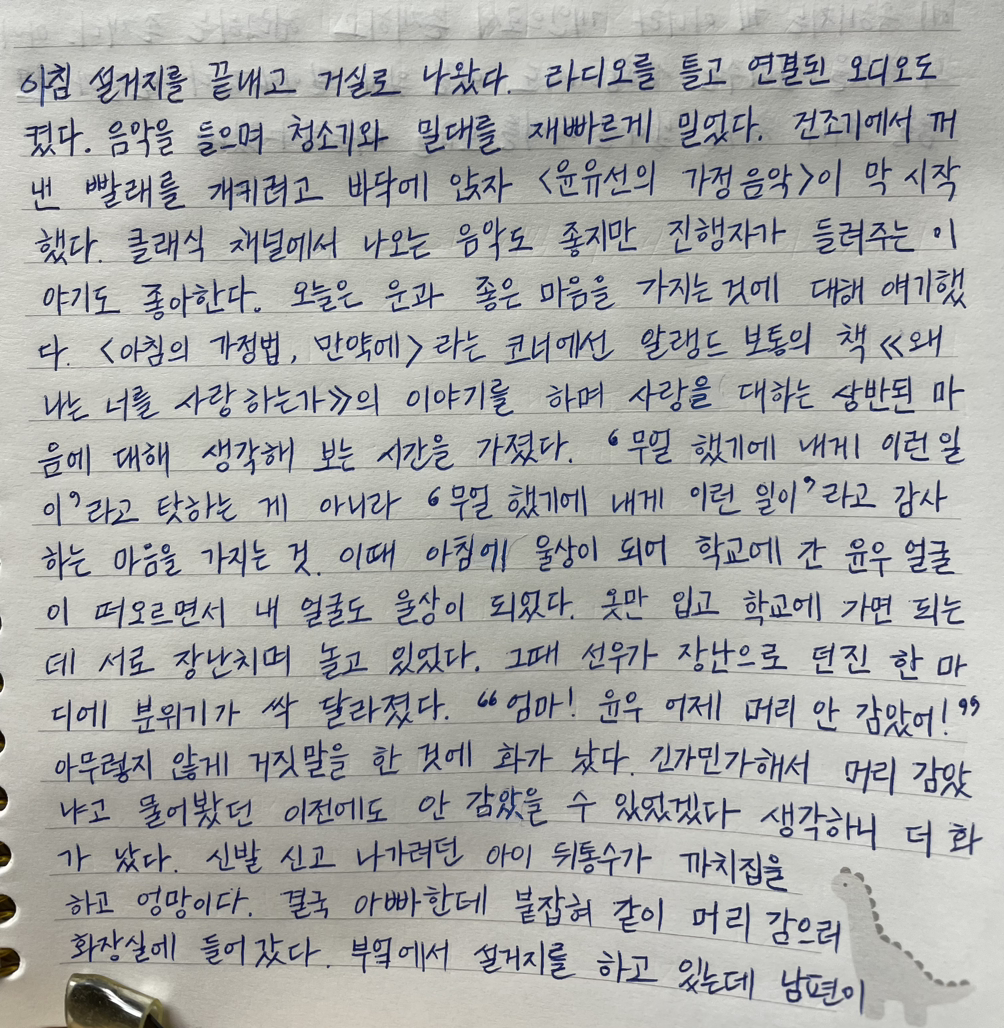 건조기에서 꺼낸 빨래를 개키려고 바닥에 앉자 <윤유선의 가정 음악>이 막 시작했다.