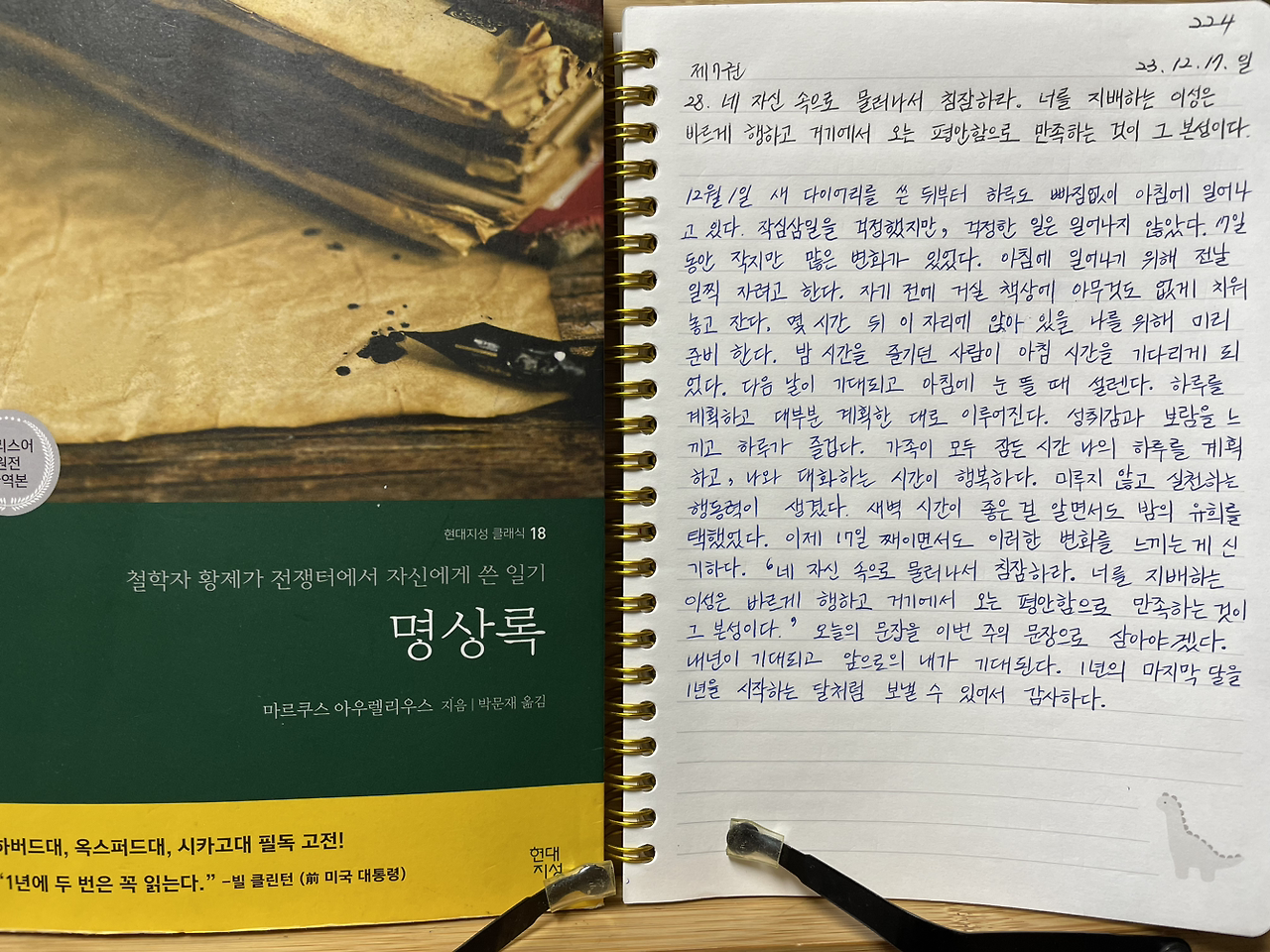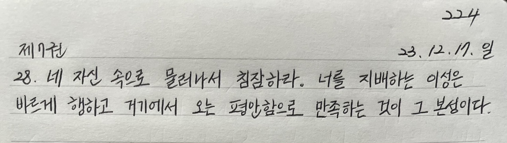 ‘네 자신 속으로 물러나서 침잠하라. 너를 지배하는 이성은 바르게 행하고 거기에서 오는 평안함으로 만족하는 것이 그 본성이다.’ 오늘의 문장을 이번 주의 문장으로 삼아야겠다.