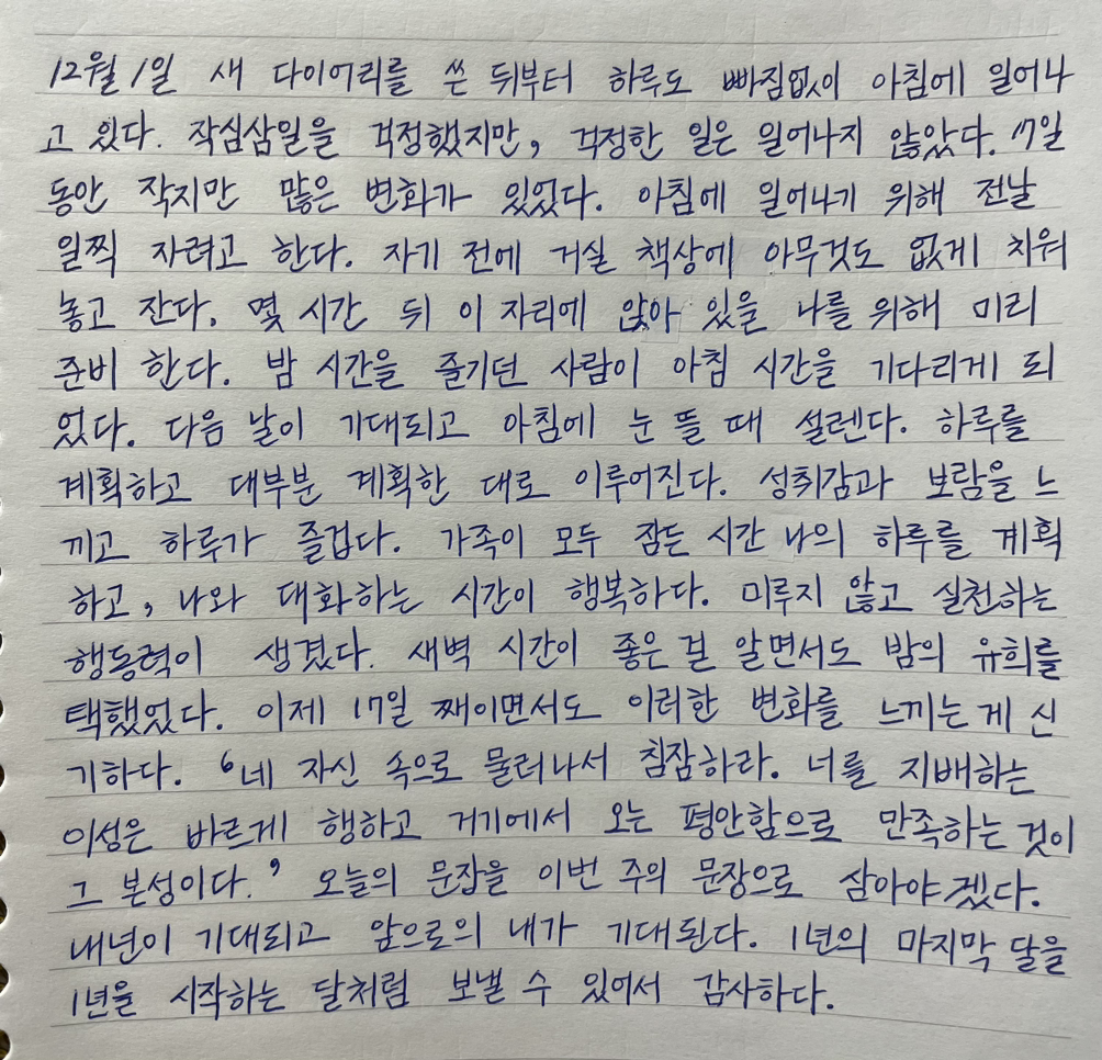 12월 1일 새 다이어리를 쓴 뒤부터 하루도 빠짐없이 아침에 일어나고 있다.