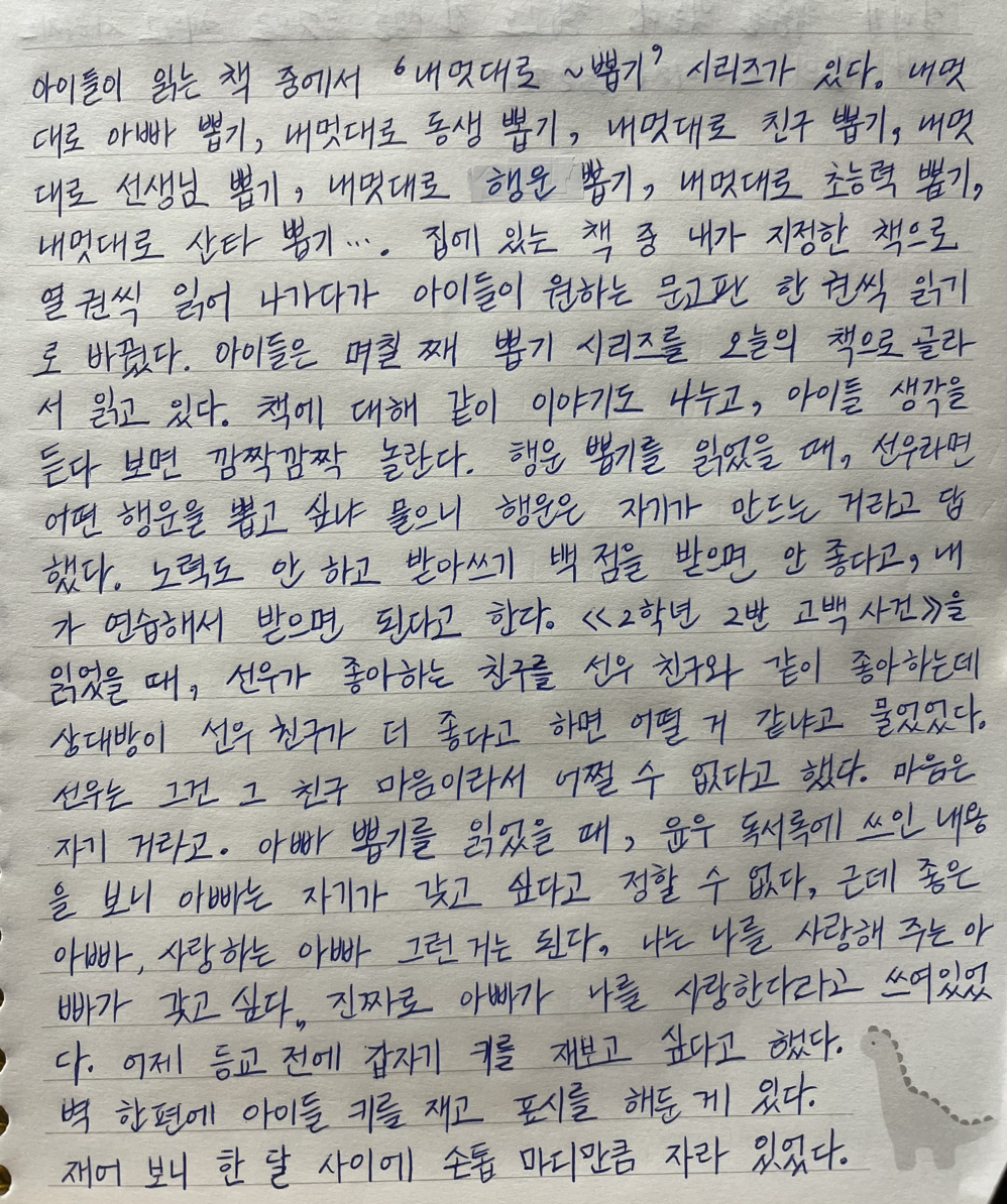 아빠 뽑기를 읽었을 때, 윤우 독서록에 쓰인 내용을 보니 아빠는 자기가 갖고 싶다고 정할 수 없다, 근데 좋은 아빠, 사랑하는 아빠 그런 거는 된다, 나는 나를 사랑해 주는 아빠가 갖고 싶다, 진짜로 아빠가 나를 사랑한다라고 쓰여있었다.