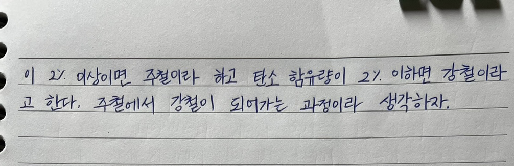 철 외의 불순물, 특히 탄소 함유량이 2% 이상이면 주철이라 하고 탄소 함유량이 2% 이하면 강철이라고 한다.