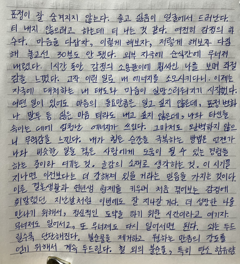 어떤 일이 있어도 마음의 동요만큼은 일고 싶지 않은데, 표정 변화나 말투 등 싫은 마음 티라도 내고 싶지 않은데, 나와 타인을 속이는 데에 엄청난 에너지가 쓰인다.
