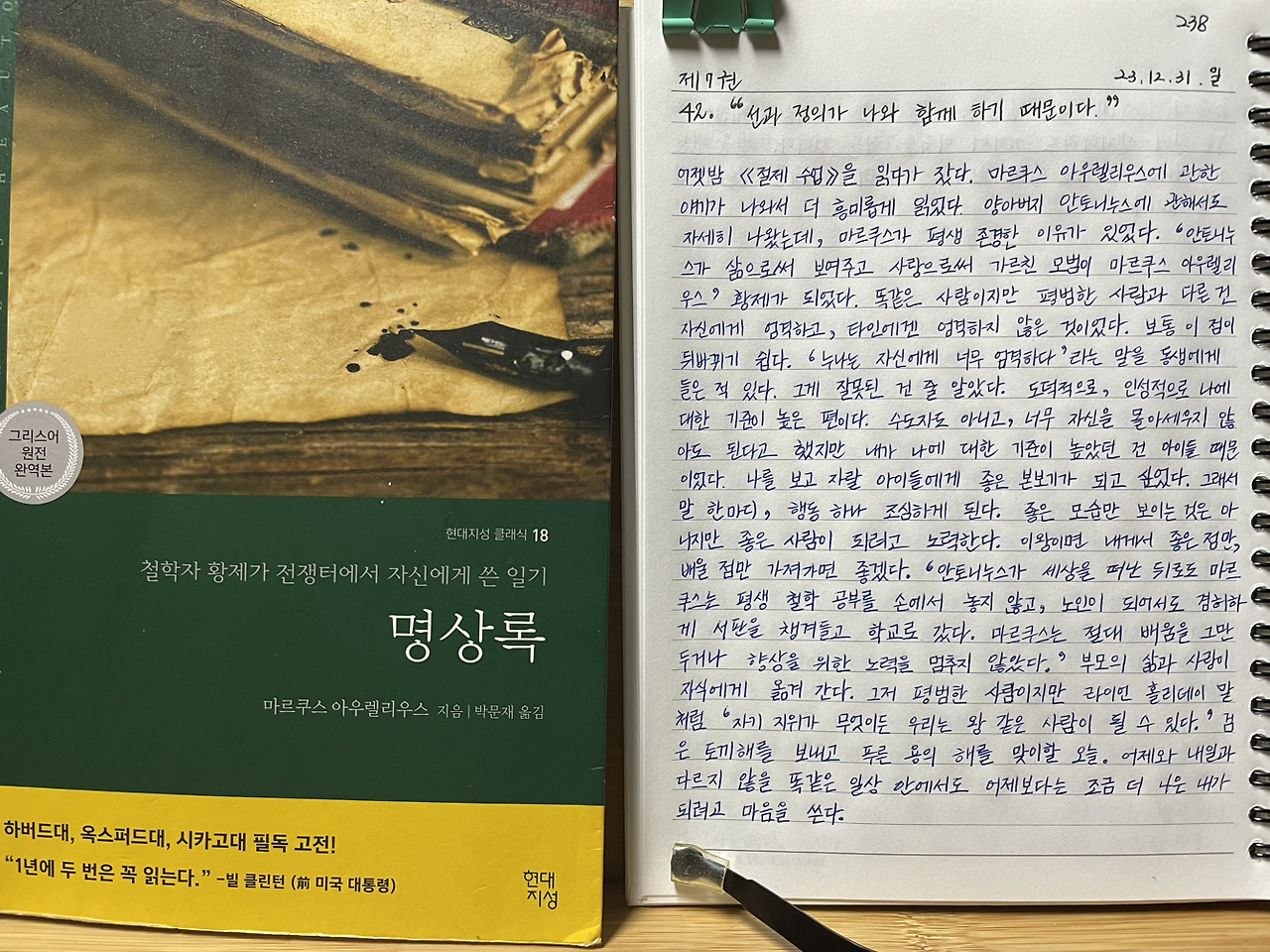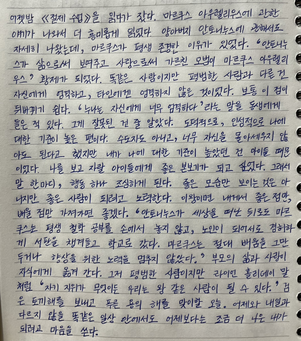 ‘안토니누스가 세상을 떠난 뒤로도 마르쿠스는 평생 철학 공부를 손에서 놓지 않고, 노인이 되어서도 겸허하게 서판을 챙겨 들고 학교로 갔다. 마르쿠스는 절대 배움을 그만두거나 향상을 위한 노력을 멈추지 않았다.’