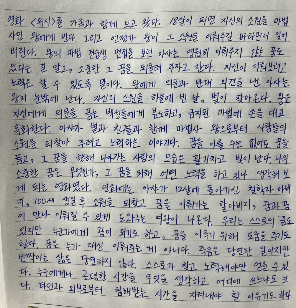 나의 소중한 꿈은 무엇인가, 그 꿈을 위해 어떤 노력을 하고 있나 생각해 보게 되는 영화였다.