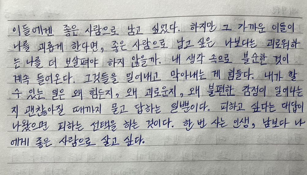누구에게나 사랑받는 사람까지는 아니지만 가까운 이들에겐 좋은 사람으로 남고 싶었다.