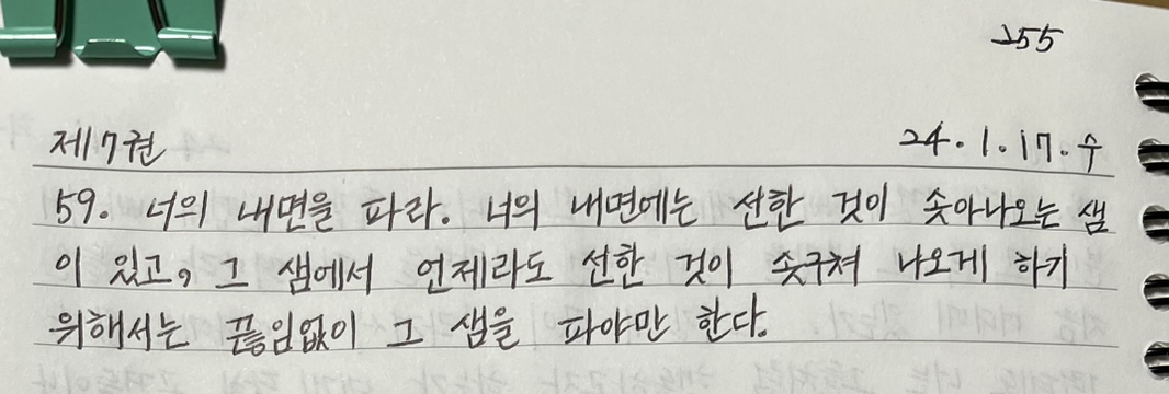 너의 내면을 파라. 너의 내면에는 선한 것이 솟아나오는 샘이 있고, 그 샘에서 언제라도 선한 것이 솟구쳐 나오게 하기 위해서는 끊임없이 그 샘을 파야만 한다.