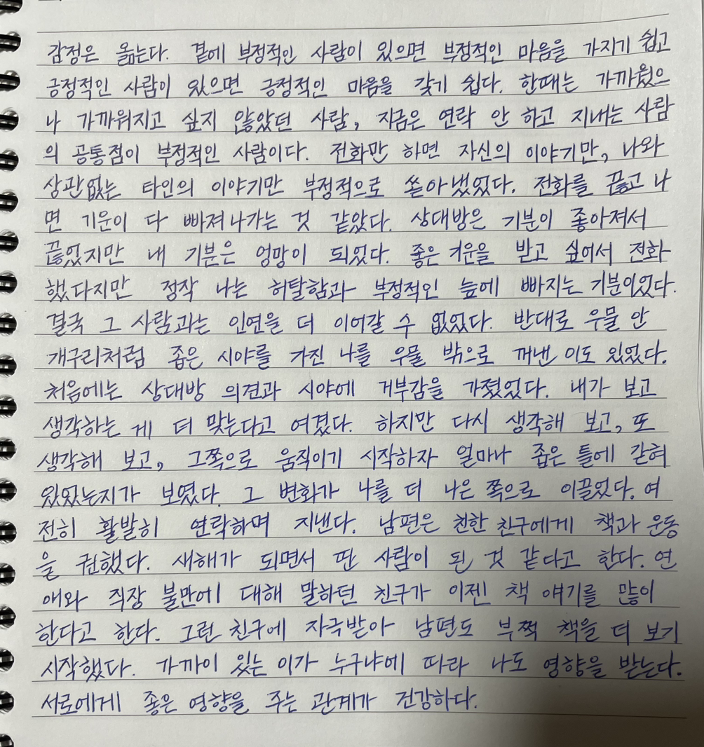 곁에 부정적인 사람이 있으면 부정적인 마음을 가지기 쉽고 긍정적인 사람이 있으면 긍정적인 마음을 갖기 쉽다.