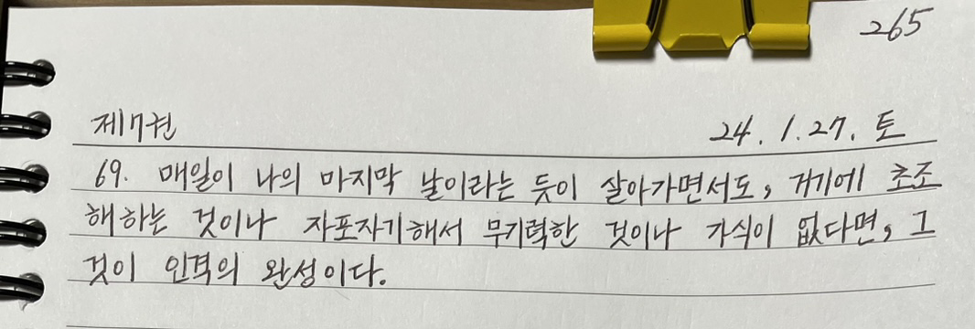 매일이 나의 마지막 날이라는 듯이 살아가면서도, 거기에 초조해하는 것이나 자포자기해서 무기력한 것이나 가식이 없다면, 그것이 인격의 완성이다.