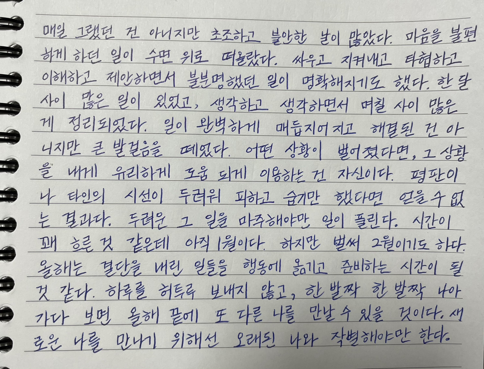 하루를 허투루 보내지 않고, 한 발짝 한 발짝 나아가다 보면 올해 끝에 또 다른 나를 만날 수 있을 것이다.