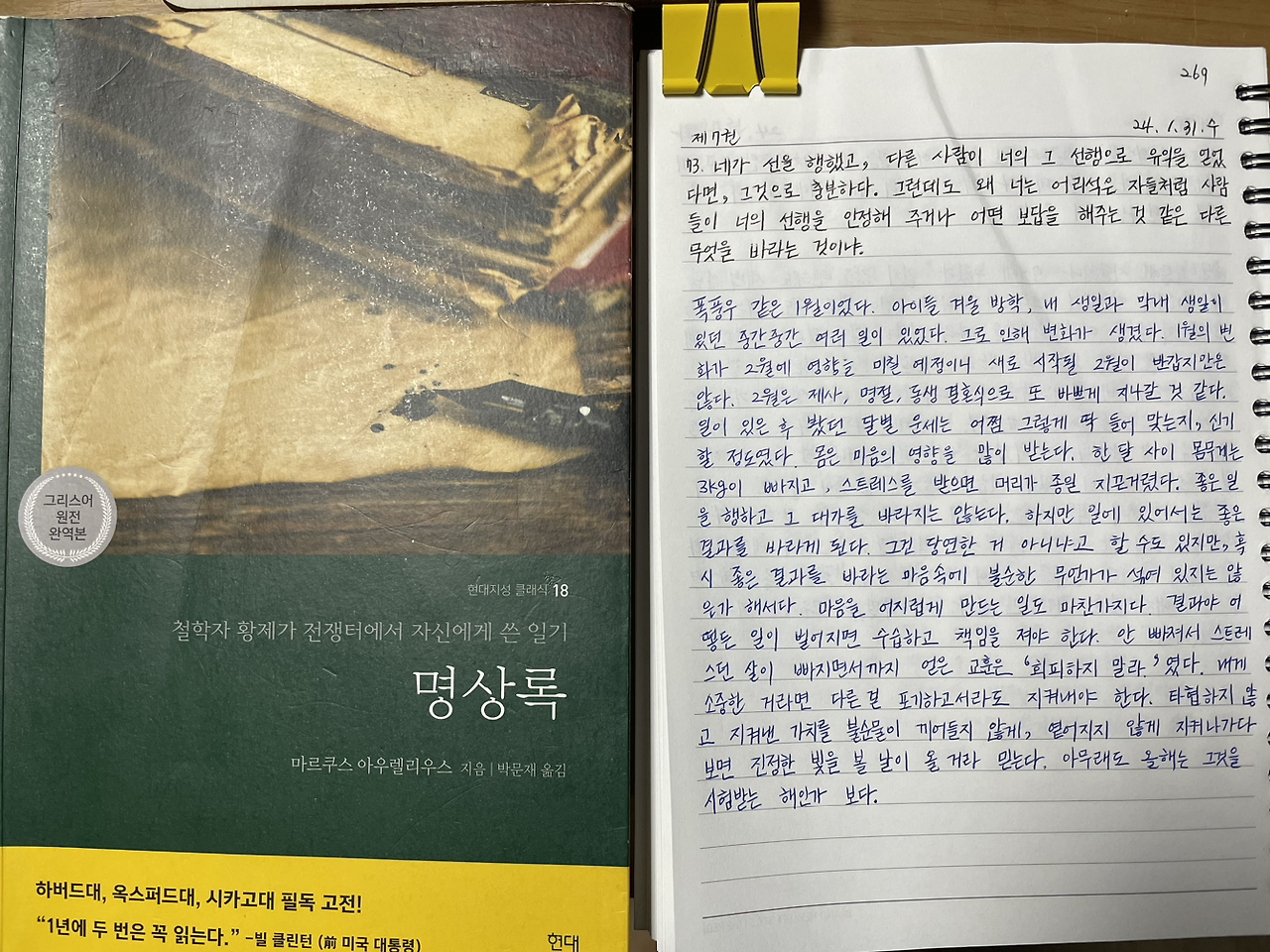 네가 선을 행했고, 다른 사람이 너의 그 선행으로 유익을 얻었다면, 그것으로 충분하다. 그런데도 왜 너는 어리석은 자들처럼 사람들이 너의 선행을 인정해 주거나 어떤 보답을 해주는 것 같은 다른 무엇을 바라는 것이냐.