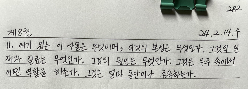 여기 있는 이 사물은 무엇이며, 이것의 본성은 무엇인가. 그것의 실재와 질료는 무엇인가. 그것의 원인은 무엇인가. 그것은 우주 속에서 어떤 역할을 하는가. 그것은 얼마 동안이나 존속하는가.
