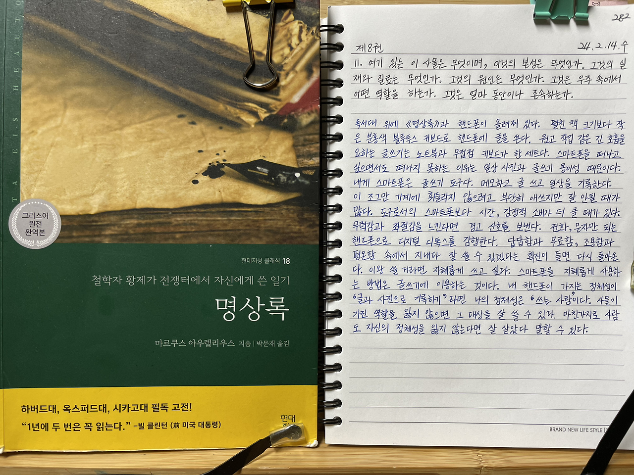독서대 위에 《명상록》과 핸드폰이 올려져 있다.