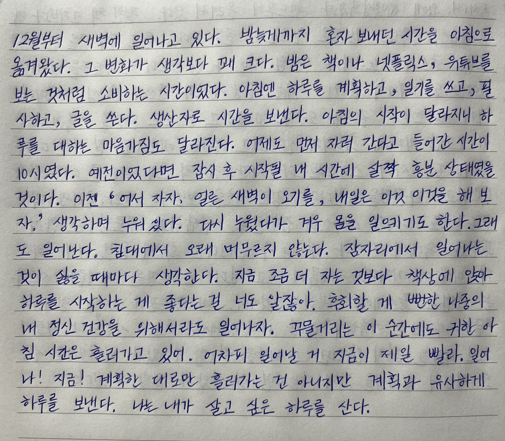 아침엔 하루를 계획하고, 일기를 쓰고, 필사하고, 글을 쓴다.