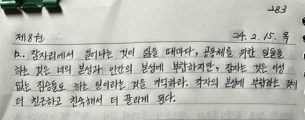 잠자리에서 일어나는 것이 싫을 때마다, 공동체를 위한 일들을 하는 것은 너의 본성과 인간의 본성에 부합하지만, 잠자는 것은 이성 없는 짐승들도 하는 일이라는 것을 기억하라. 각자의 본성에 부합하는 것이 더 친근하고 친숙해서 더 끌리게 된다.