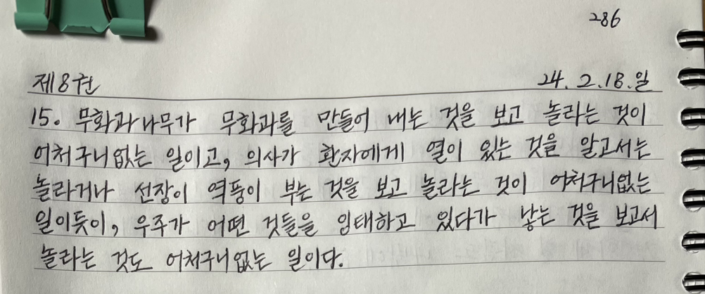 무화과나무가 무화과를 만들어 내는 것을 보고 놀라는 것이 어처구니없는 일이고, 의사가 환자에게 열이 있는 것을 알고서는 놀라거나 선장이 역풍이 부는 것을 보고 놀라는 것이 어처구니없는 일이듯이, 우주가 어떤 것들을 잉태하고 있다가 낳는 것을 보고서 놀라는 것도 어처구니없는 일이다.