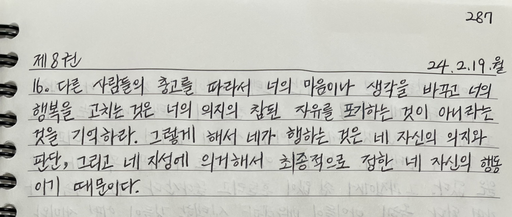 그렇게 해서 네가 행하는 것은 네 자신의 의지와 판단, 그리고 네 지성에 의거해서 최종적으로 정한 네 자신의 행동이기 때문이다.