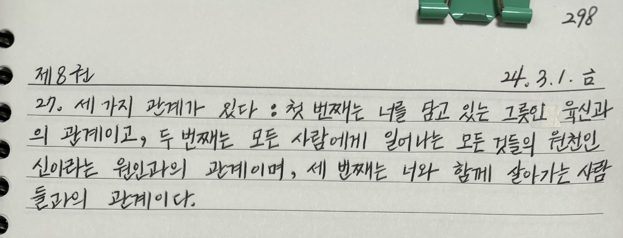 세 가지 관계가 있다 : 첫 번째는 너를 담고 있는 그릇인 육신과의 관계이고, 두 번째는 모든 사람에게 일어나는 모든 것들의 원천인 신이라는 원인과의 관계이며, 세 번째는 너와 함께 살아가는 사람들과의 관계이다.