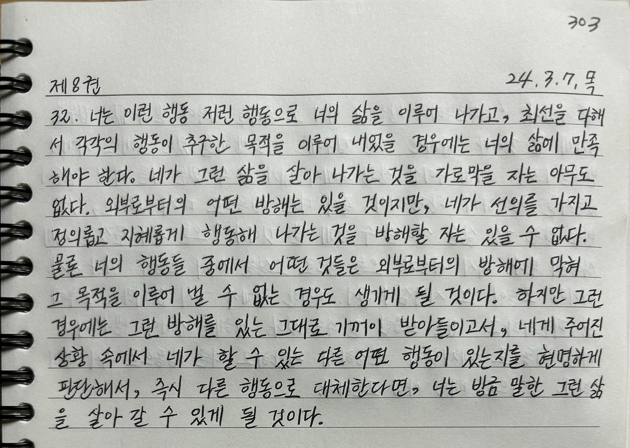 '외부로부터의 방해에 막혀 그 목적을 이루어 낼 수 없는 경우도 생기게 될 것이다. 하지만 그런 경우에는 그런 방해를 있는 그대로 기꺼이 받아들이고서, 네게 주어진 상황 속에서 네가 할 수 있는 다른 어떤 행동이 있는지를 현명하게 판단해서, 즉시 다른 행동으로 대체한다면, 너는 방금 말한 그런 삶을 살아갈 수 있게 될 것이다.'