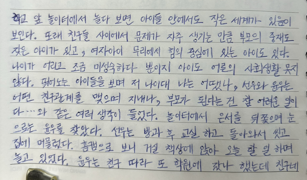 뛰어노는 아이들을 보며 저 나이대 나는 어땠나, 선우와 윤우는 어떤 친구 관계를 맺으며 지내나, 부모가 된다는 건 참 어려운 일이다 … 와 같은 여러 생각이 들었다.
