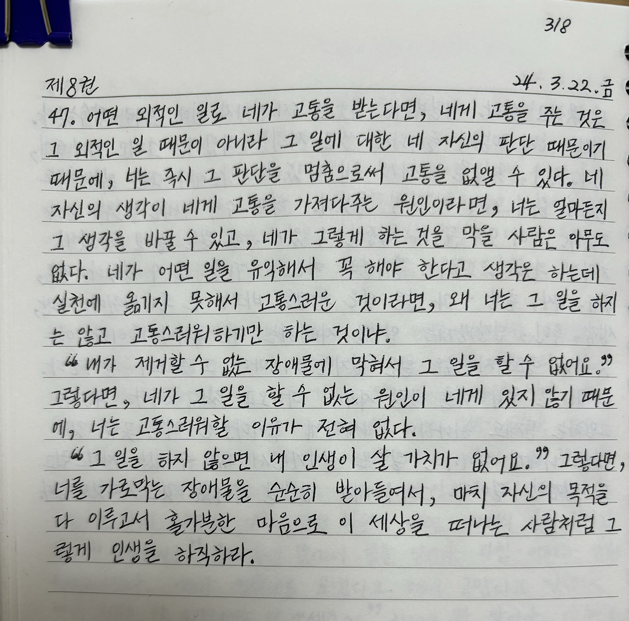 어떤 외적인 일로 네가 고통을 받는다면, 네게 고통을 주는 것은 그 외적인 일 때문이 아니라 그 일에 대한 네 자신의 판단 때문이기 때문에, 너는 즉시 그 판단을 멈춤으로써 고통을 없앨 수 있다.