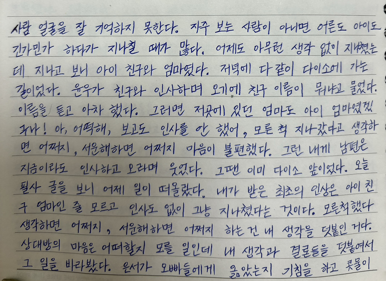 아, 어떡해, 보고도 인사를 안 했어, 모른 척 지나갔다고 생각하면 어쩌지, 서운해하면 어쩌지 마음이 불편했다.