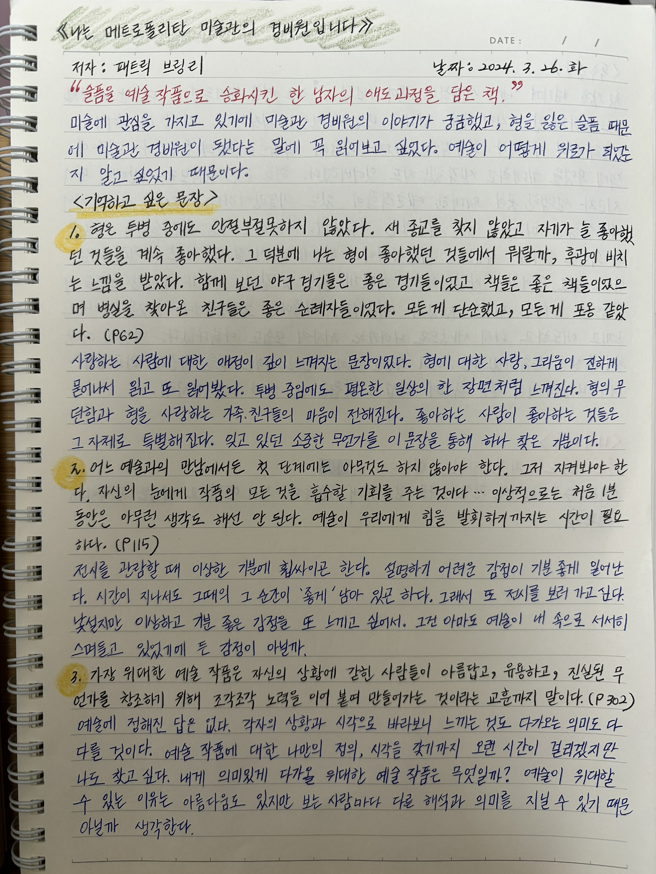 형을 잃은 슬픔 때문에 미술관 경비원이 됐다는 말에 단순한 호기심에서 꼭 읽어보고 싶은 마음으로 변했다.