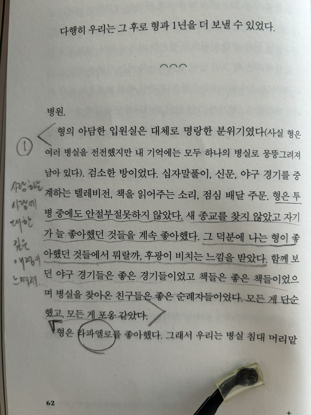 형은 투병 중에도 안절부절못하지 않았다. 새 종교를 찾지 않았고 자기가 늘 좋아했던 것들을 계속 좋아했다. 그 덕분에 나는 형이 좋아했던 것들에서 뭐랄까, 후광이 비치는 느낌을 받았다. 함께 보던 야구 경기들은 좋은 경기들이었고 책들은 좋은 책들이었으며 병실을 찾아온 친구들은 좋은 순례자들이었다. 모든 게 단순했고, 포옹 같았다. (p62)