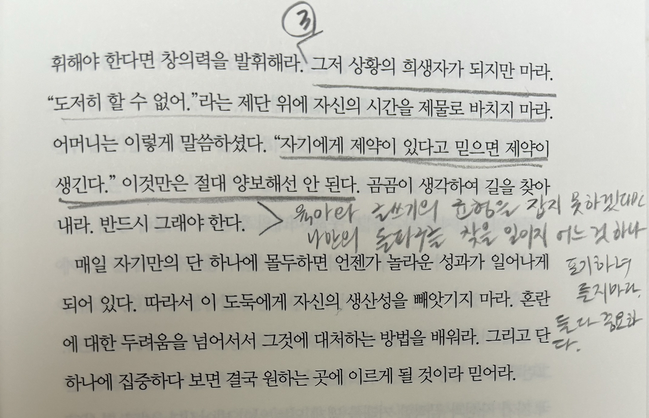 그저 상황의 희생자가 되지만 마라. "도저히 할 수 없어."라는 제단 위에 자신의 시간을 제물로 바치지 마라. 어머니는 이렇게 말씀하셨다. "자기에게 제약이 있다고 믿으면 제약이 생긴다." 이것만은 절대 양보해선 안 된다. 곰곰이 생각하여 길을 찾아내라. 반드시 그래야 한다. (p247)