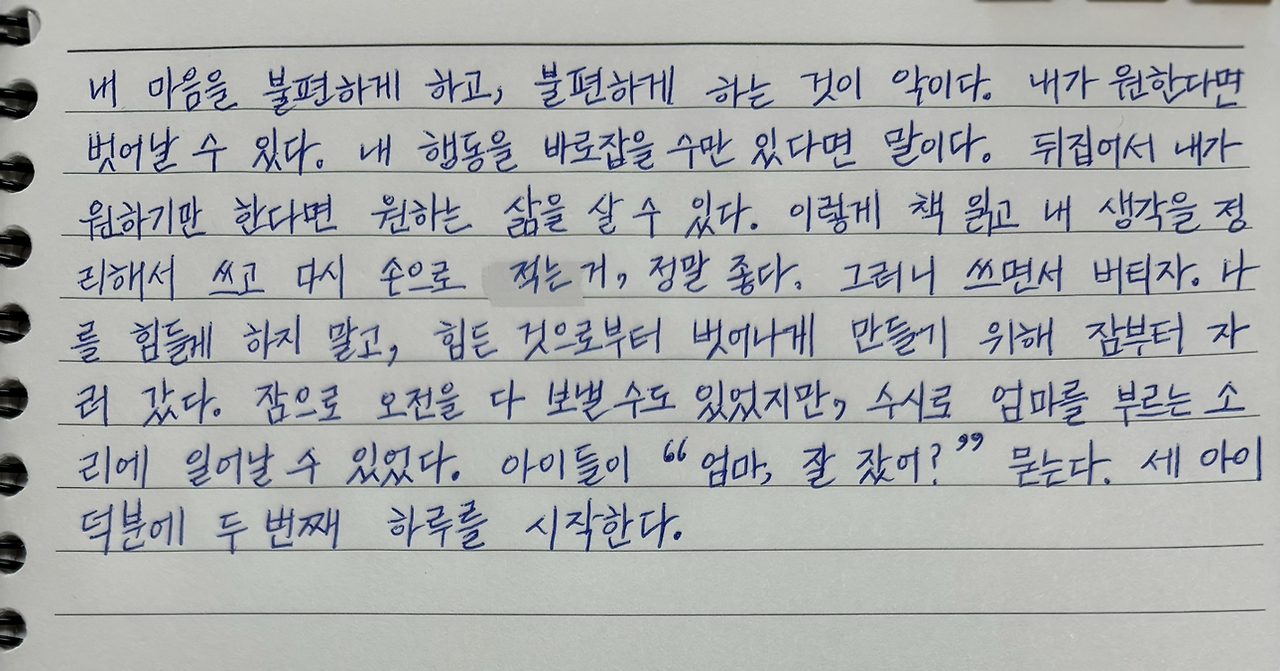 그런데도 자지 않고 버티며 마지막 줄까지 쓰고 있었던 이유는 일기라도 마무리 짓고, 필사 글에 대해서도 더 풀어놓고 자고 싶어서였다.