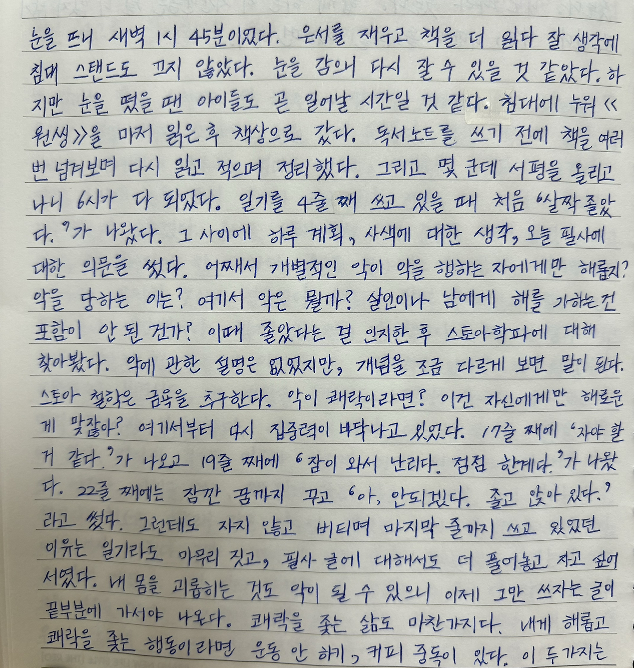 22줄 째에는 잠깐 꿈까지 꾸고 '아, 안 되겠다. 졸고 앉아 있다.'라고 썼다.