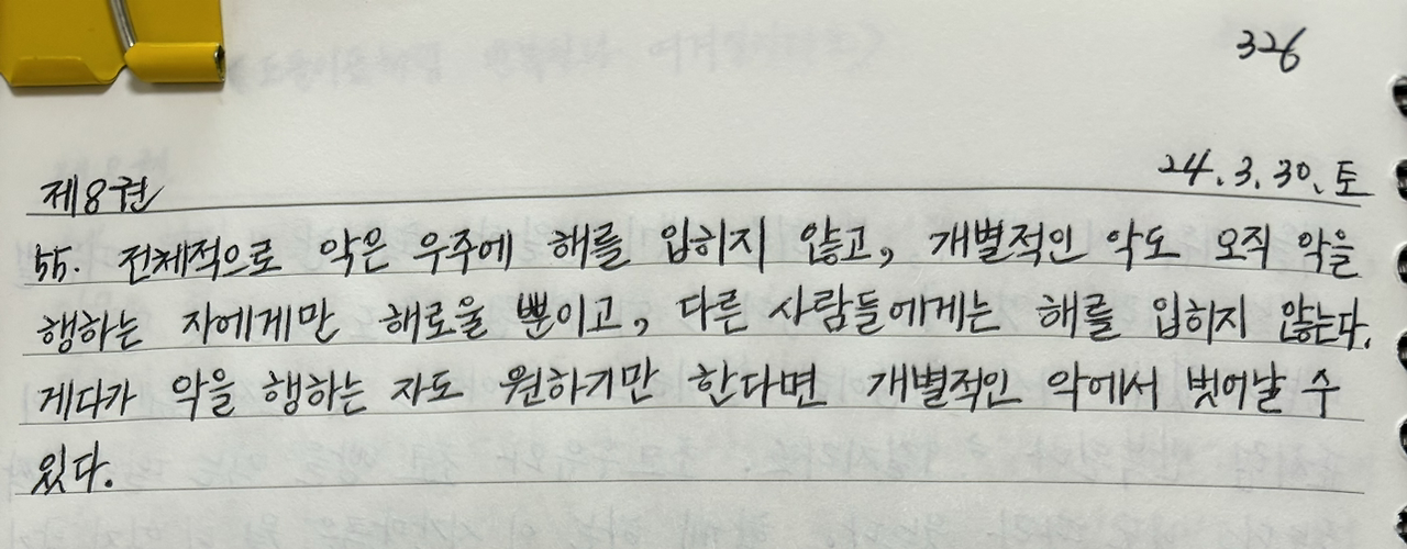 어째서 개별적인 악이 악을 행하는 자에게만 해롭지? 악을 당하는 이는? 여기서 악은 뭘까? 살인이나 남에게 해를 가하는 건 포함이 안 된 건가?