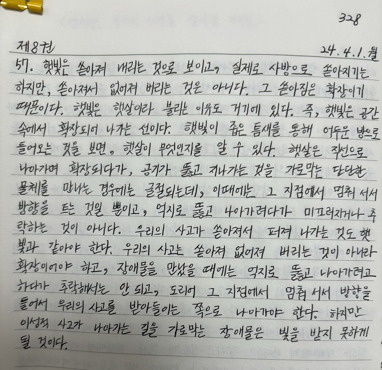 우리의 사고가 쏟아져서 퍼져 나가는 것도 햇빛과 같아야 한다. 우리의 사고는 쏟아져 없어져 버리는 것이 아니라 확장이어야 하고, 장애물을 만났을 때에는 억지로 뚫고 나아가려고 하다가 추락해서는 안 되고, 도리어 그 지점에서 멈춰 서서 방향을 틀어서 우리의 사고를 받아들이는 쪽으로 나아가야 한다.