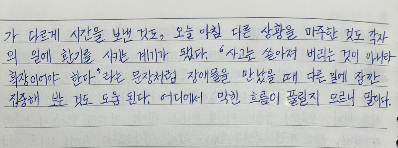 '사고는 쏟아져 없어져 버리는 것이 아니라 확장이어야 한다'라는 문장처럼 장애물을 만났을 때 다른 일에 잠깐 집중해 보는 것도 도움 된다.