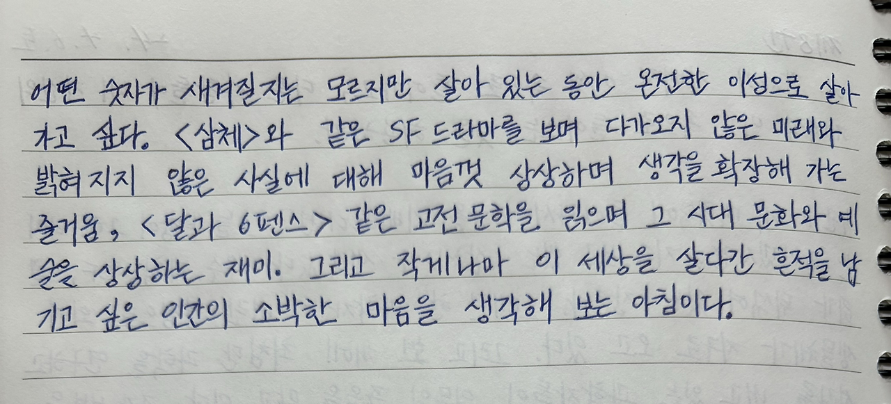 <삼체>와 같은 SF 드라마를 보며 다가오지 않은 미래와 밝혀지지 않은 사실에 대해 마음껏 상상하며 생각을 확장해 가는 즐거움, <달과 6펜스> 같은 고전 문학을 읽으며 그 시대 문화와 예술을 상상하는 재미.