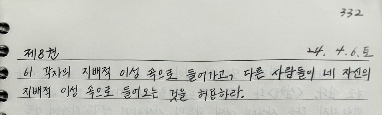 각자의 지배적 이성 속으로 들어가고, 다른 사람들이 네 자신의 지배적 이성 속으로 들어오는 것을 허용하라.