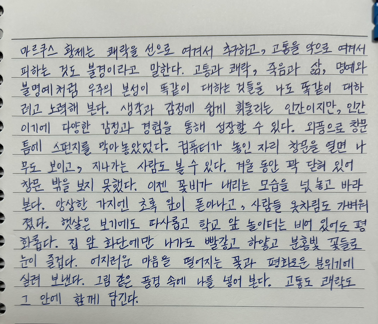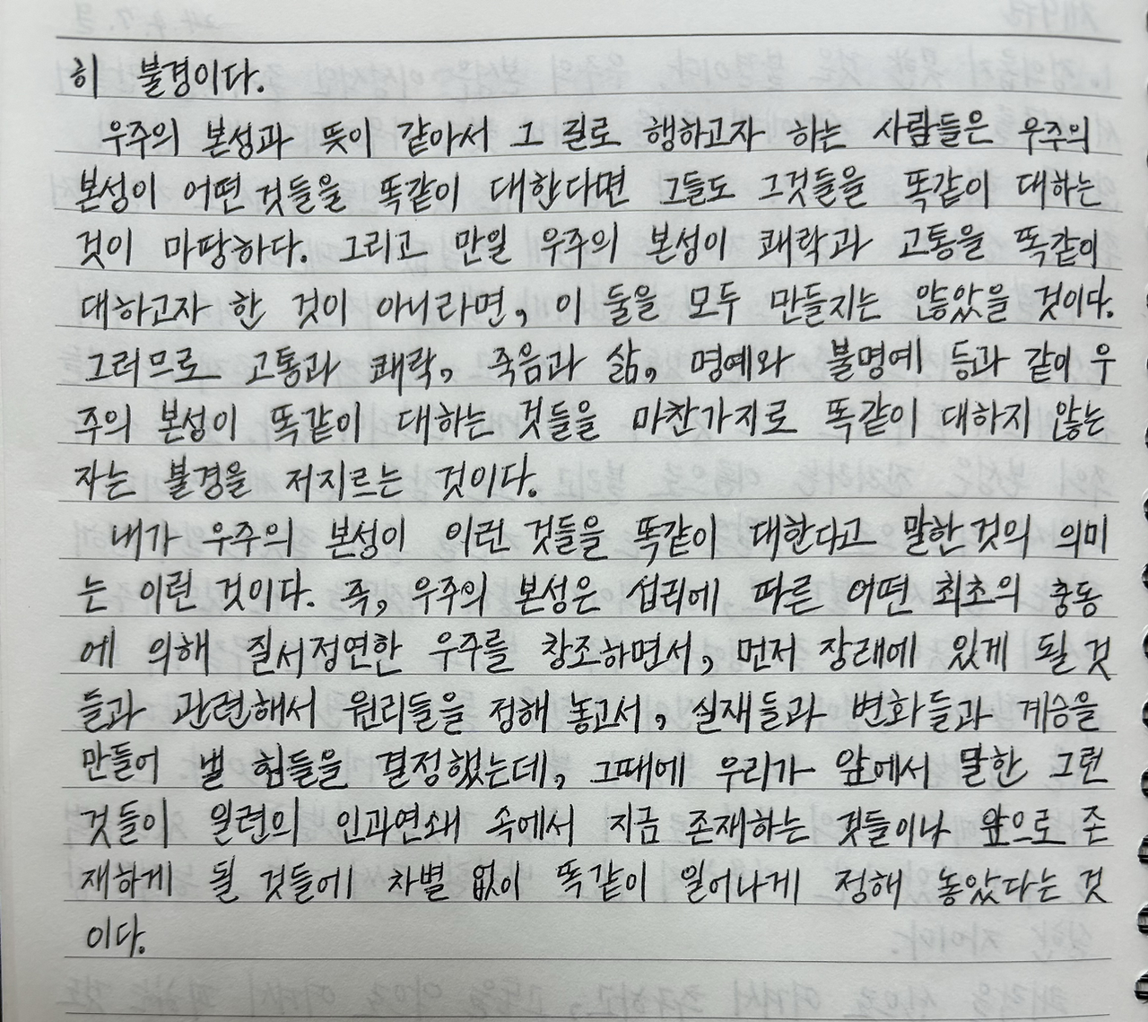 고통과 쾌락, 죽음과 삶, 명예와 불명예처럼 우주의 본성이 똑같이 대하는 것들을 나도 똑같이 대하려고 노력해 본다.