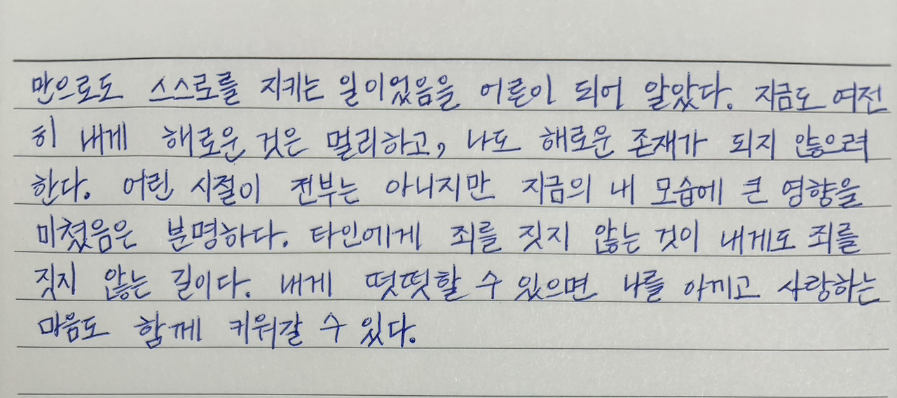 누군가에게 상처 주고 해로운 대상이 되지 않으려고 노력하는 것만으로도 스스로를 지키는 일이었음을 어른이 되어 알았다.