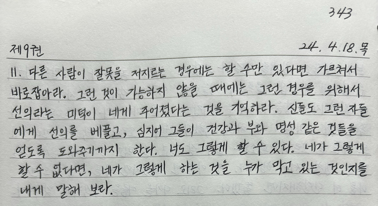다른 사람이 잘못을 저지르는 경우에는 할 수만 있다면 가르쳐서 바로잡아라. 그런 것이 가능하지 않을 때에는 그런 경우를 위해서 선의라는 미덕이 네게 주어졌다는 것을 기억하라.