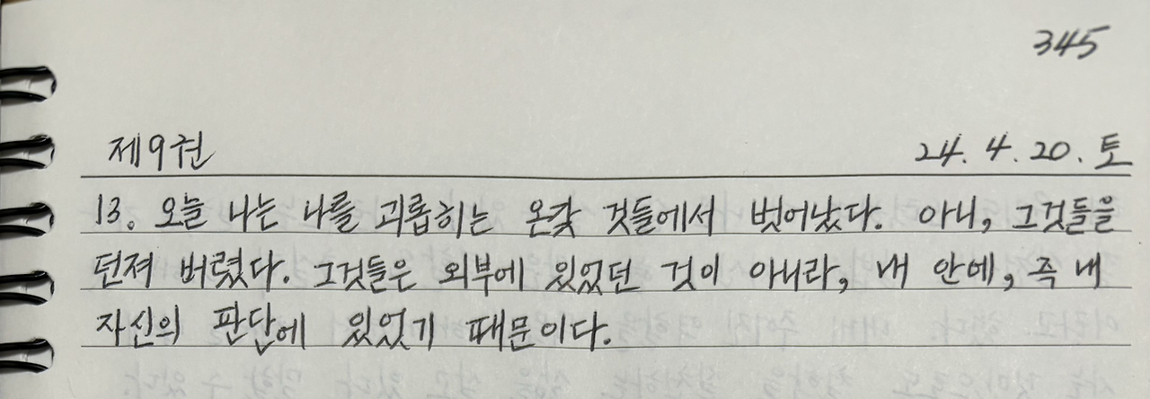 오늘 나는 나를 괴롭히는 온갖 것들에서 벗어났다. 아니, 그것들을 던져 버렸다. 그것들은 외부에 있었던 것이 아니라, 내 안에, 즉 내 자신의 판단에 있었기 때문이다.