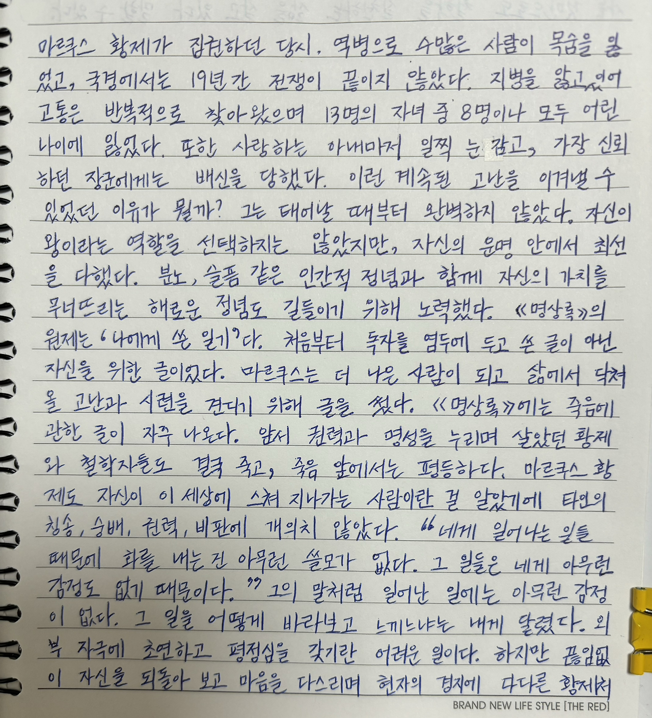 하지만 끊임없이 자신을 되돌아보고 마음을 다스리며 현자의 경지에 다다른 황제처럼 우리도 노력하면 더 나은 삶을 살 수 있다.