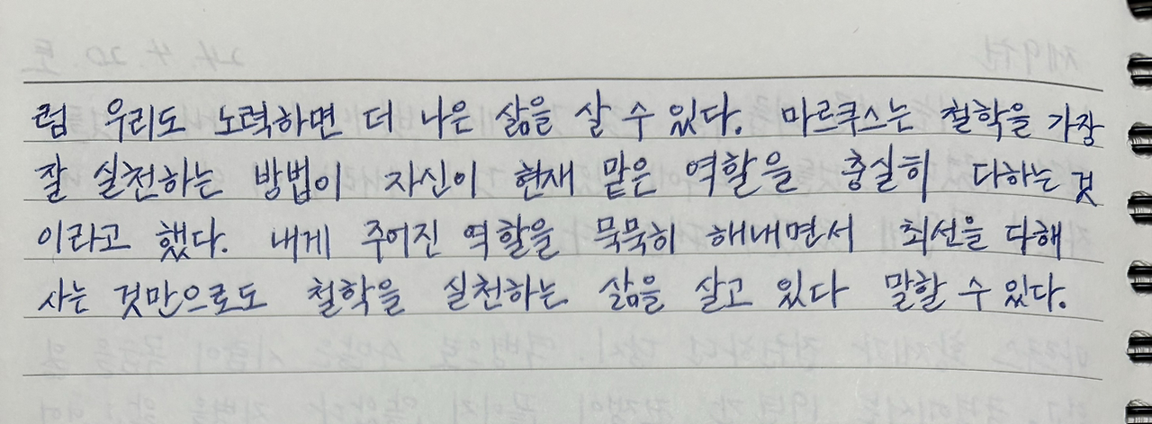 내게 주어진 역할을 묵묵히 해내면서 최선을 다해 사는 것만으로도 철학을 실천하는 삶을 살고 있다 말할 수 있다.