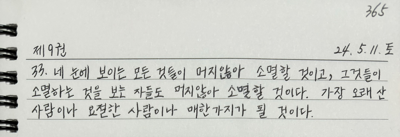 네 눈에 보이는 모든 것들이 머지않아 소멸할 것이고, 그것들이 소멸하는 것을 보는 자들도 머지않아 소멸할 것이다. 가장 오래 산 사람이나 요절한 사람이나 매한가지가 될 것이다.