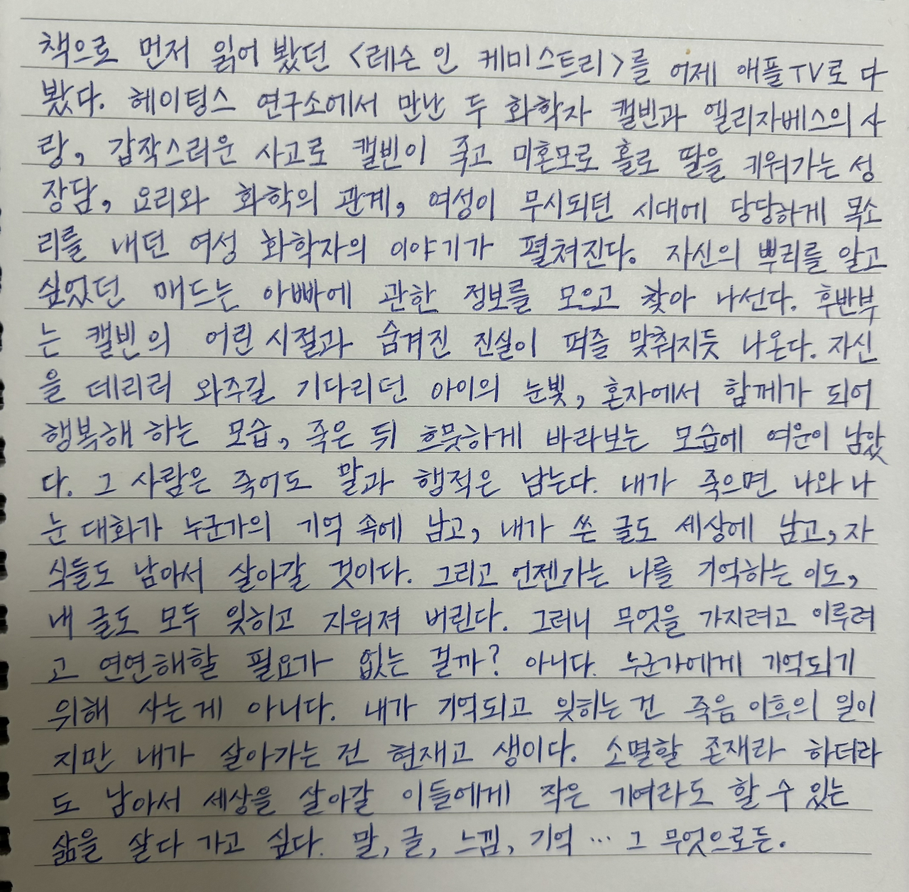 책으로 먼저 읽어 봤던 <레슨 인 케미스트리>를 어제 애플 TV로 다 봤다.