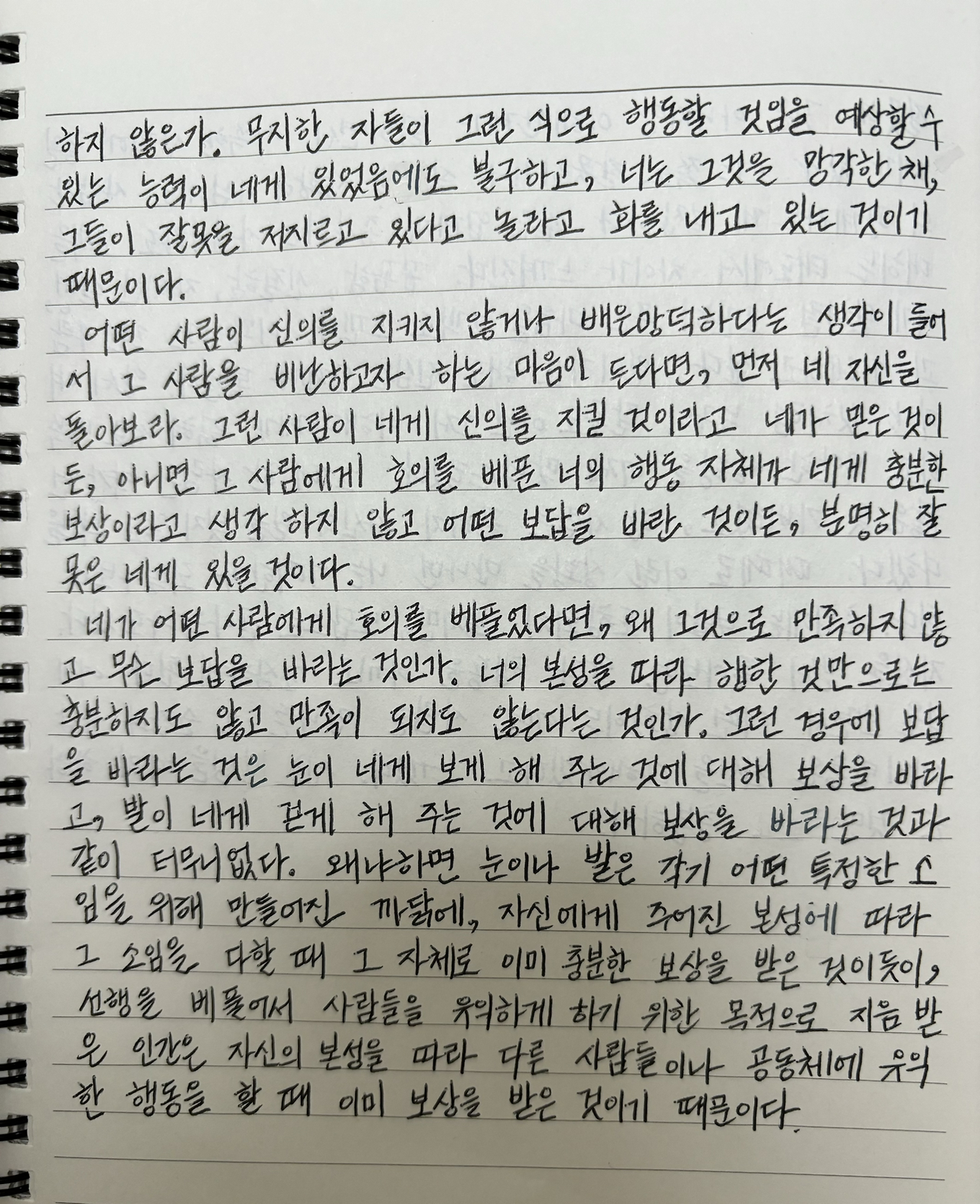 네가 어떤 사람에게 호의를 베풀었다면, 왜 그것으로 만족하지 않고 무슨 보답을 바라는 것인가. 너의 본성을 따라 행한 것만으로는 충분하지도 않고 만족이 되지도 않는다는 것인가.
