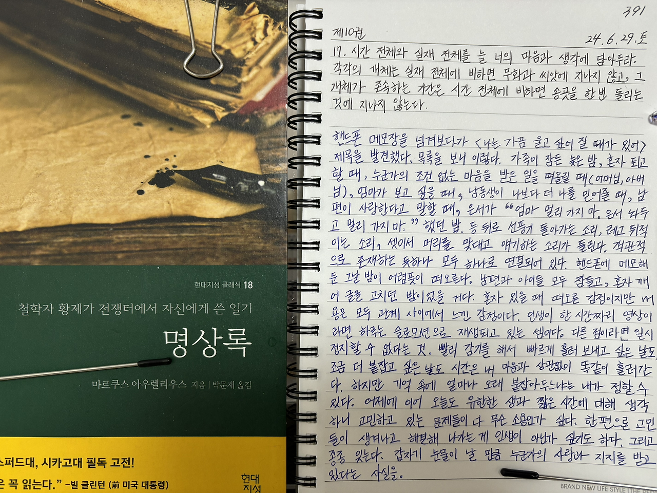 시간 전체와 실재 전체를 늘 너의 마음과 생각에 담아두라. 각각의 개체는 실재 전체에 비하면 무화과 씨앗에 지나지 않고, 그 개체가 존속하는 기간은 시간 전체에 비하면 송곳을 한 번 돌리는 것에 지나지 않는다.