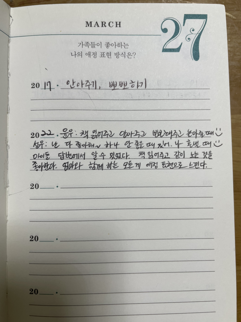 "나는 책 읽어주고 안아주고 뽀뽀해 주고 놀아 줄 때!" (윤우)