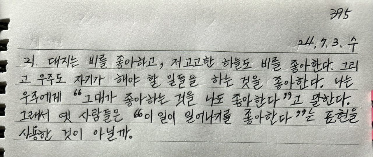 대지는 비를 좋아하고, 저 고고한 하늘도 비를 좋아한다. 그리고 우주도 자기가 해야 할 일들을 하는 것을 좋아한다. 나는 우주에게 “그대가 좋아하는 것을 나도 좋아한다”고 말한다. 그래서 옛 사람들은 “이 일이 일어나기를 좋아한다”는 표현을 사용한 것이 아닐까.