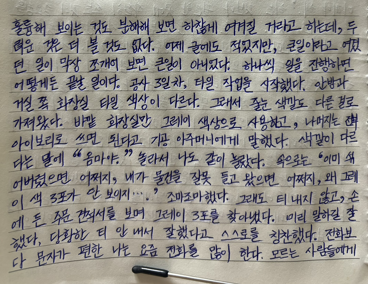 바깥 화장실만 그레이 색상으로 사용하고, 나머지는 전부 아이보리로 쓰면 된다고 기공 아주머니에게 말했다.